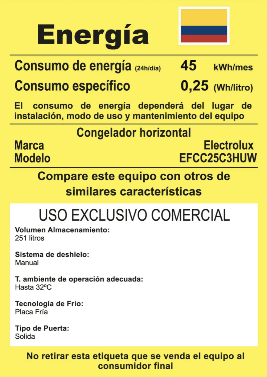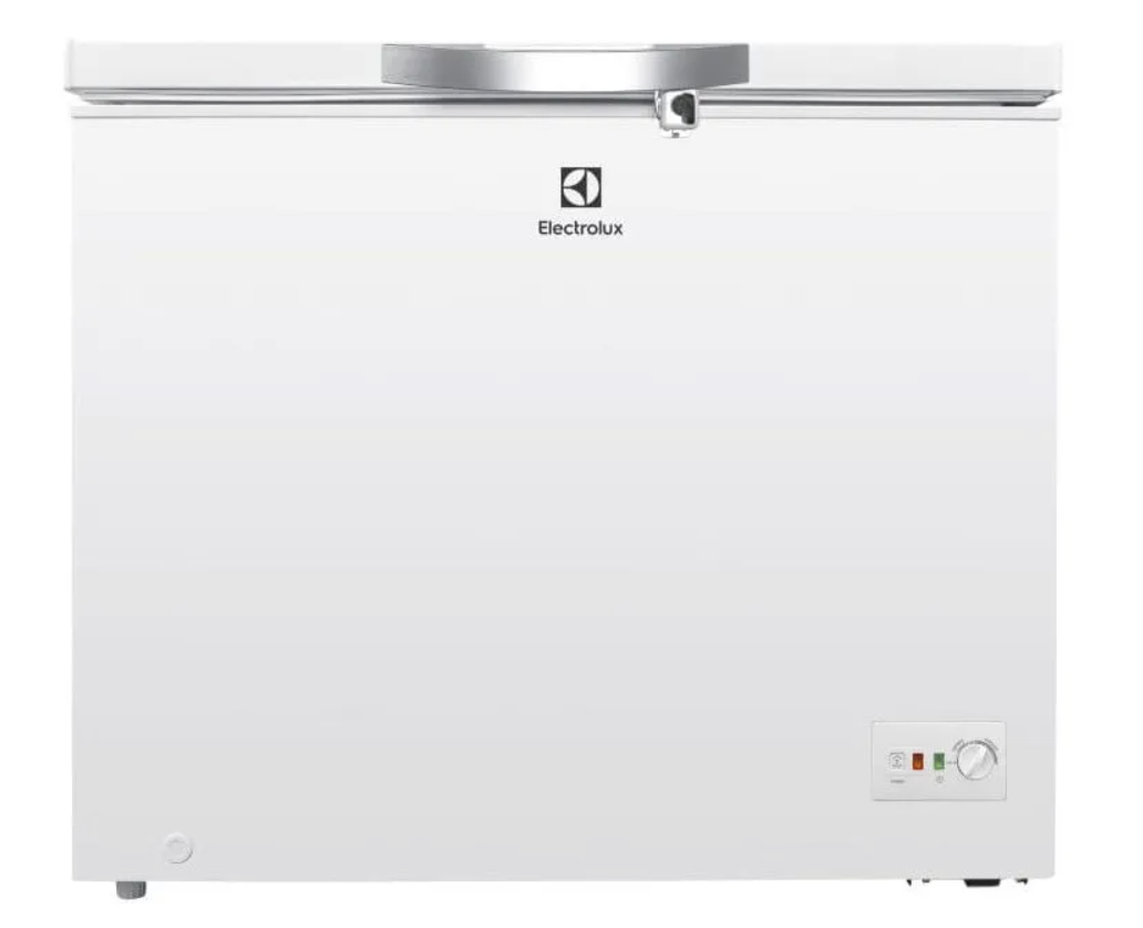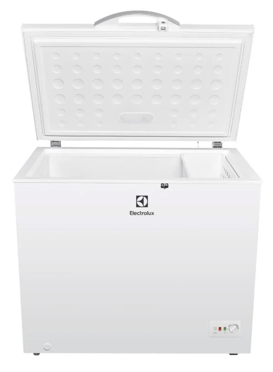 El congelador horizontal EFCC25C3HUW cuenta con una capacidad de 251L netos, es de una sola puerta y opera con control de temperatura mecánico. Está clasificado con 4 estrellas, alcanzando una temperatura de -18 °C para conservar los alimentos por más tiempo. Incluye una Función Turbo que permite alcanzar -21 °C para un congelamiento más rápido. Este modelo también ofrece la posibilidad de refrigerar gracias a su función dual. Para la organización de los alimentos, dispone de 1 canastilla que facilita el acceso a pequeños artículos o aquellos de uso frecuente. El mecanismo de descongelación es manual y cuenta con un drenaje para eliminar el agua. Utiliza gas refrigerante R600, contribuyendo a la protección de la capa de ozono. Incorpora luz LED que se activa al abrir el congelador, mejorando la visibilidad y organización de los alimentos. Las luces indicadoras de función incluyen una luz verde que señala el correcto funcionamiento del compresor y una luz naranja que indica que la opción turbo está activa. Para facilitar su desplazamiento, viene equipado con 4 ruedas. Su funcionamiento es de bajo nivel de ruido y para mayor seguridad, incluye una llave que se expulsa al cerrar la puerta.